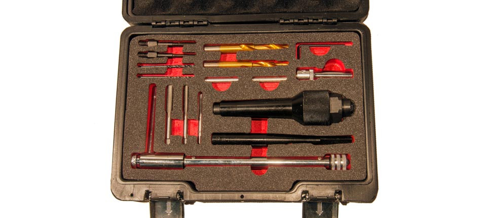 A középső beszakadt elektródát távolítsa el a dugókulcs (crowafej) (1) segítségével. Ha nem sikerül az alsó forrasztásnál elválasztani az elektródát, akkor az izzítógyertya közepét fúrja ki a fúróvezetők (10) segítségével a mellékelt fúrószárral (11).  A megfelelő kúpos fúrót (2) helyezze a fúró telepítőbe (3), majd az imbuszkulcs segítségével rögzítse. A fúrót vastagon zsírozza (az alacsony furdulatszám miatt többször mossa le a fémforgácsot). A legkisebb menetfúrót (5) helyezzük be a racsnis hajtóba (6), és hajtsuk az izzítógyertyába. Távolítsa el a forgácsot. Az egyik menetes szárat (8) helyezze be a csavaranyás központosítóba (7,9), és csavarja be a szárat az izzítógyertyába, majd az anyacsavar segítségével húzza ki. Ezután lehet új menetet készíteni a megfelelő menetfúró kiválasztása után (4). Ne felejtse el zsírral vastagon bekenni, hogy elkerülje a forgácsok bekerülését a motor égésterébe. A forgácsok és a menetfúró eltávolítása után becsavarható az új izzítógyertya.
