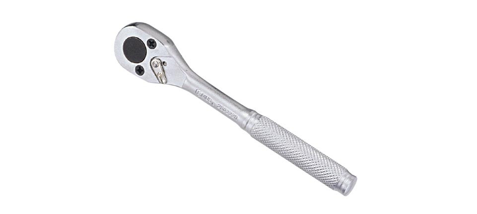 Irányváltós racsnis csavarbehajtó crowahoz, csúszásmentes recézett fém markolattal.