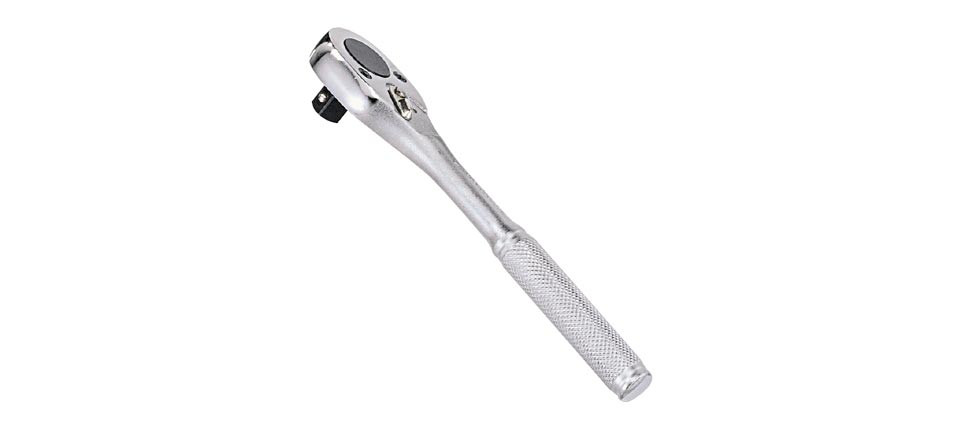Irányváltós racsnis csavarbehajtó crowahoz, csúszásmentes recézett fém markolattal.