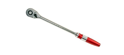 Gyors kioldógombos, biztonsági reteszelésű (quick-release) racsnis csavarbehajtó, csúszásmentes alumínium markolattal.