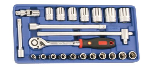 - 1db 1/2" gyors kioldógombos, biztonsági reteszelésű (quick-release) racsnis csavarbehajtó, ergonómikus gumi borítású csúszásmentes markolattal (36 fogas)