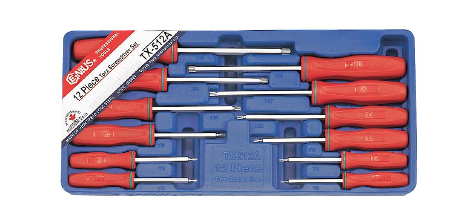 12 darabos csavarhúzó készlet, T-torx (külső), lyukas.