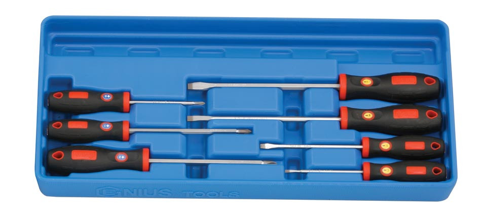 A készlet szögletes és kerekszárú csavarhúzókat tartalmaz, melyek gumírozott markolata csúszásmentes és ergonómikus kialakításúak a kisebb erőkifejtés érdekében.