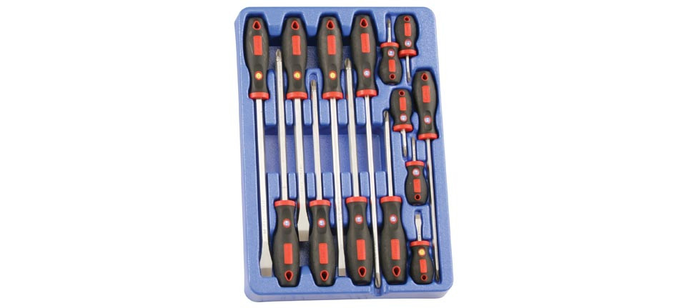 14 db csavarhúzók csúszásmentes gumírozott, ergonómikus markolattal.