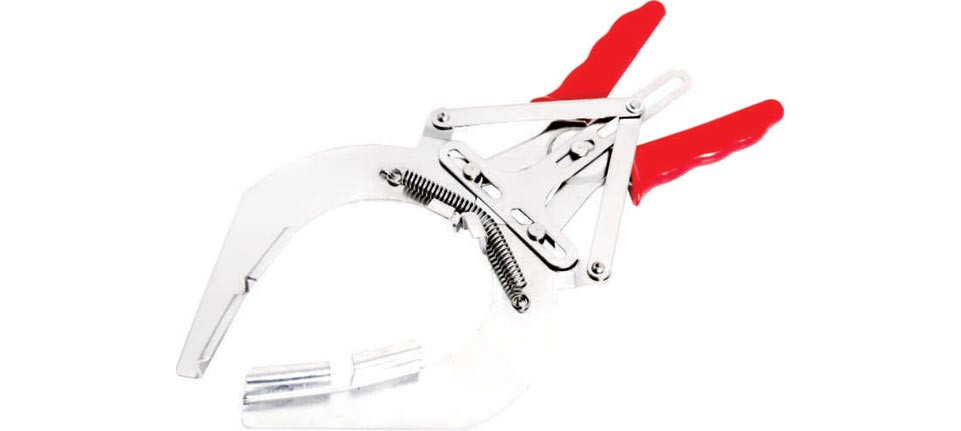 Dugattyúgyűrűk eltávolítására és felszerelésére alkalmas speciális fogó, műanyag markolattal.