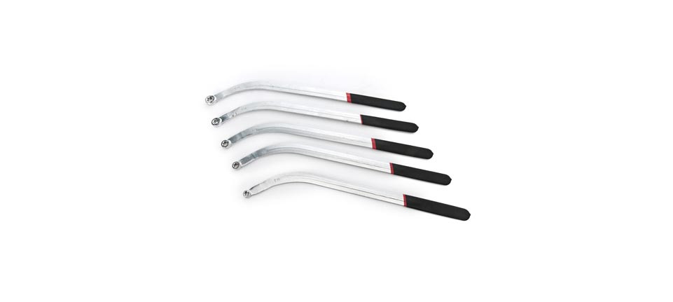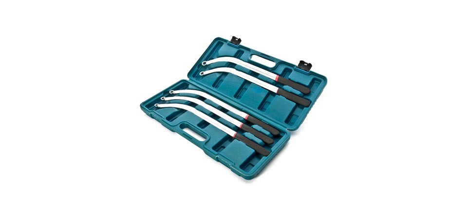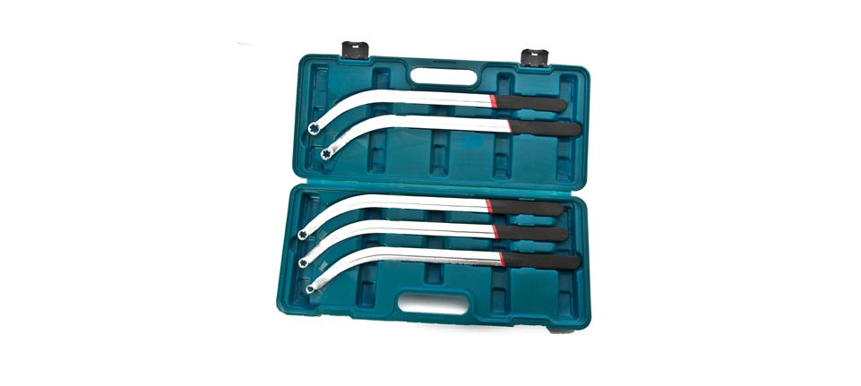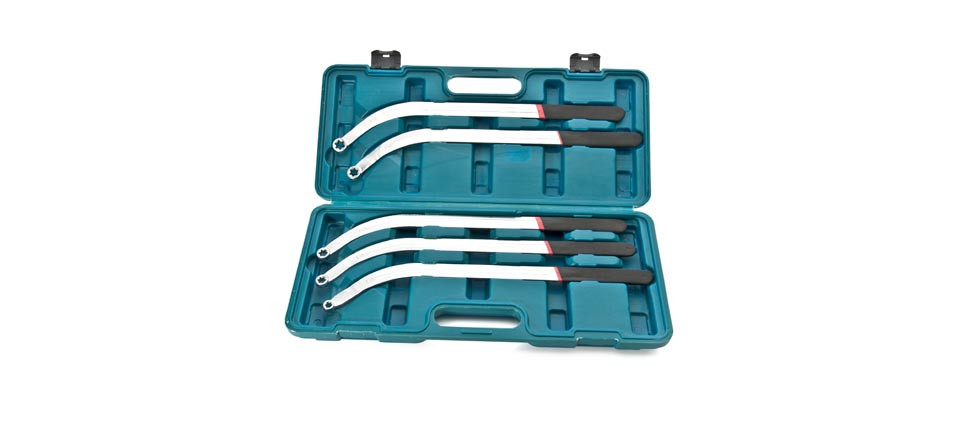 5 darab hosszú, enyhe C alakban hajlított kulcskészlet, lapos és bordás szíjak cseréjéhez, szereléséhez.