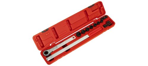 Racsnis hajtókar és csatlakozófej készlet ékszíjtárcsák, ékszíjak feszítésére, le és felszerelésére.