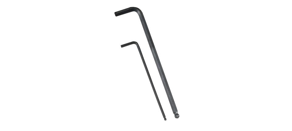 L-alakú imbuszkulcs, metrikus. Rövid felén egyenes, hosszú felén gömbvégű szárral.