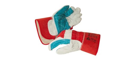 Erősített munkáskesztyű, hasított tehénbőrből és piros pamut szövetből.
