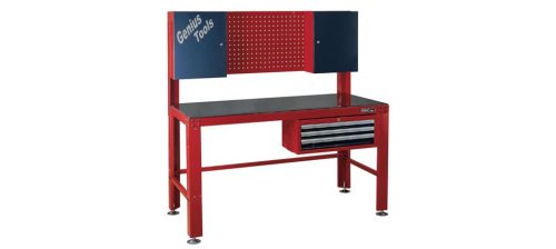 Multifunkciós munka és satupad, 2 zárható faliszekrénnyel és 3 görgős fiókkal.