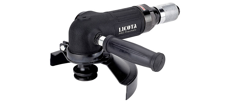 Forgó reteszelésű (Be/kikapcsolás) sarok csiszoló (köszörű), levegő meghajtással, oldalmarkolattal.