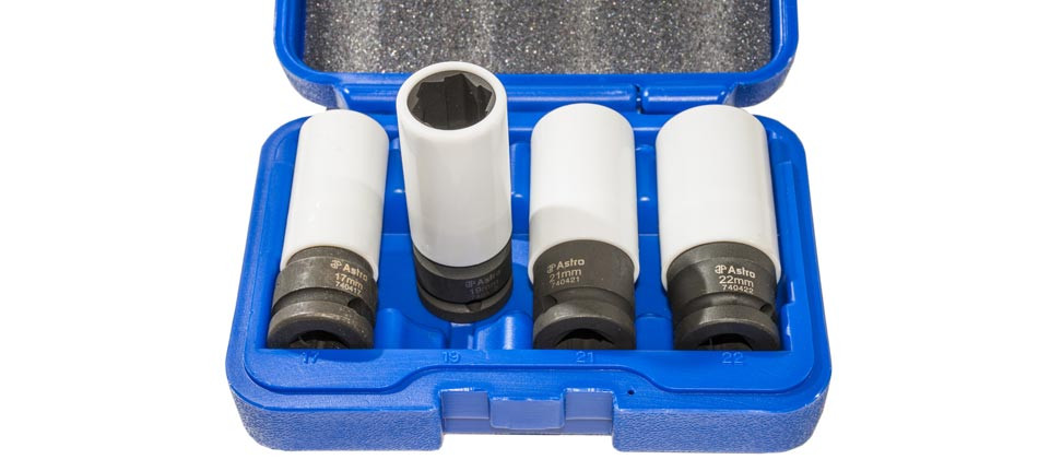 A készlet tartalma: 4 darab speciális 6-lapos, hosszú légkulcsfej, méret: 17, 19, 21, 22mm