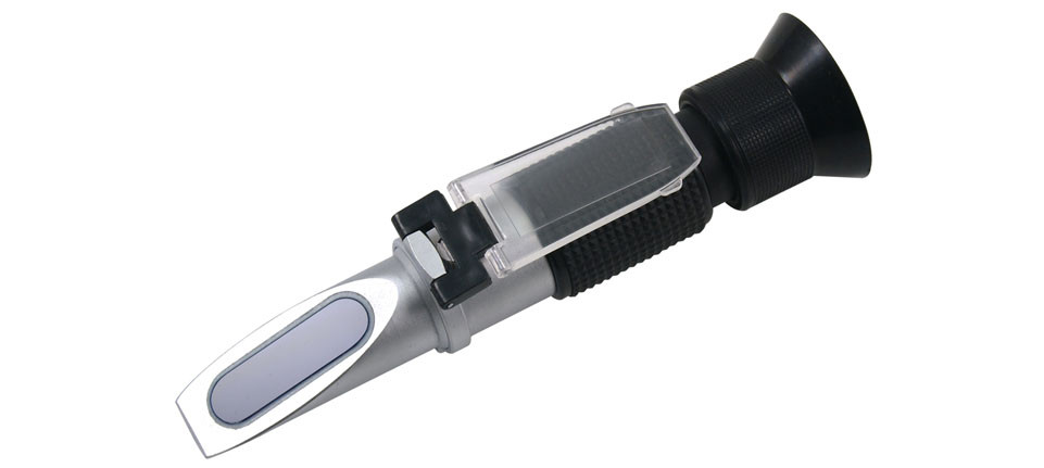 4. lépés: Az 1. lépésben leírtak szerint helyezzen néhány cseppet a mérendő folyadékból a fénytörő prizmára, majd annak fedelét becsukva, és a fénybe nézve leolvashatja a kék és fehér rész találkozásában az adott folyadék fagyáspontját/sűrűségét.