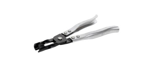 Hosszú, hajlított szelepszár szimering fogó. Recézett fém markolattal.