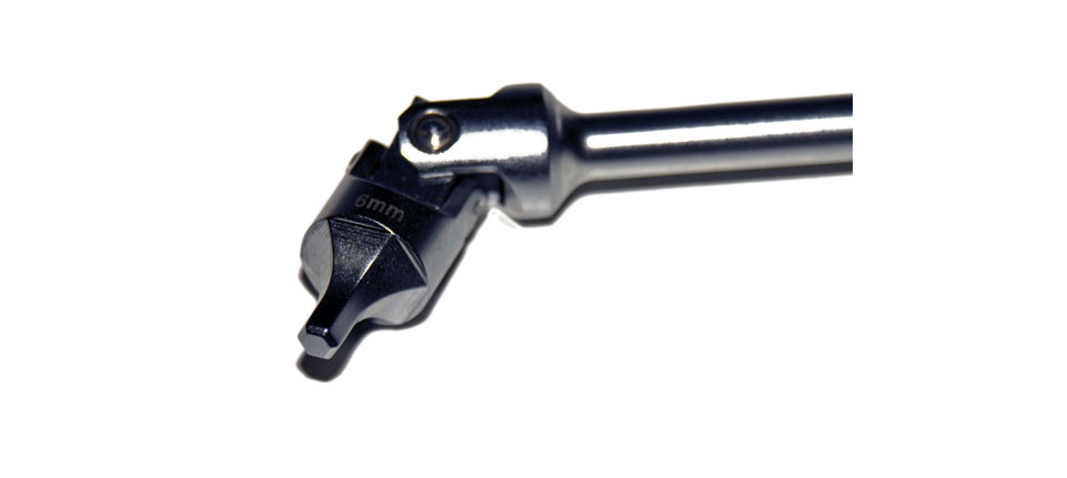 Hosszú T-kulcs, kardáncsuklós imbusz végződéssel.