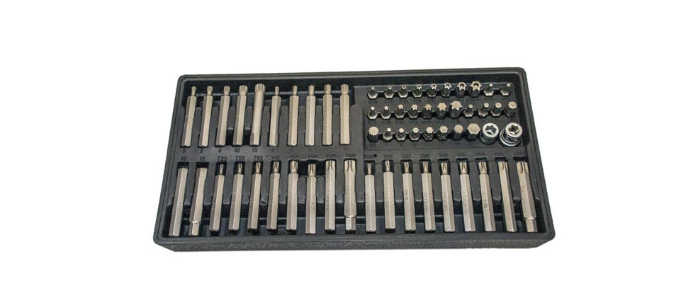 - 9db külső torx bit, 75mm hosszú: T-20, 25, 27, 30, 40, 45, 50, 55, 60