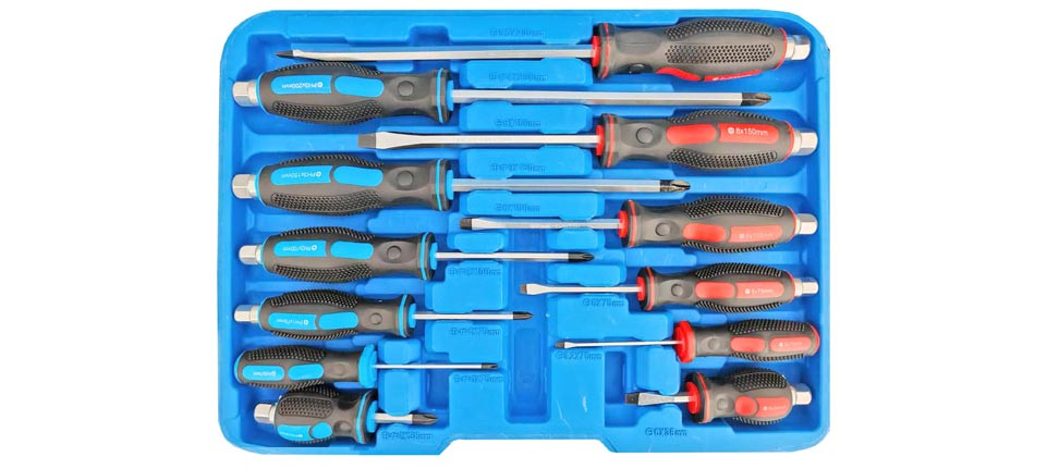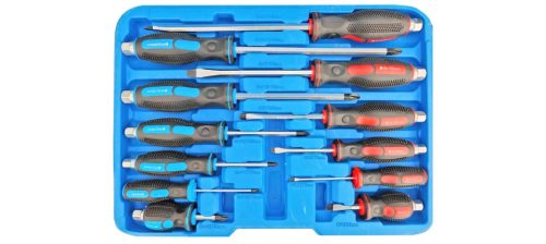 12 darabos üthető csavarhúzó készlet ergonómikus, gumírozott csúszásmentes markolattal.