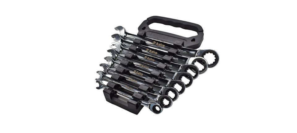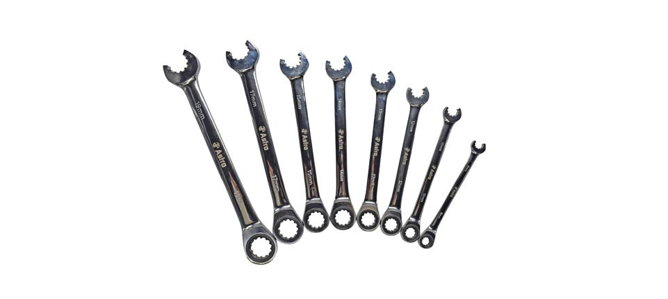 8 db-os univerzális, racsnis, csillag-villás kulcs készlet, tükörfényes polírozású.