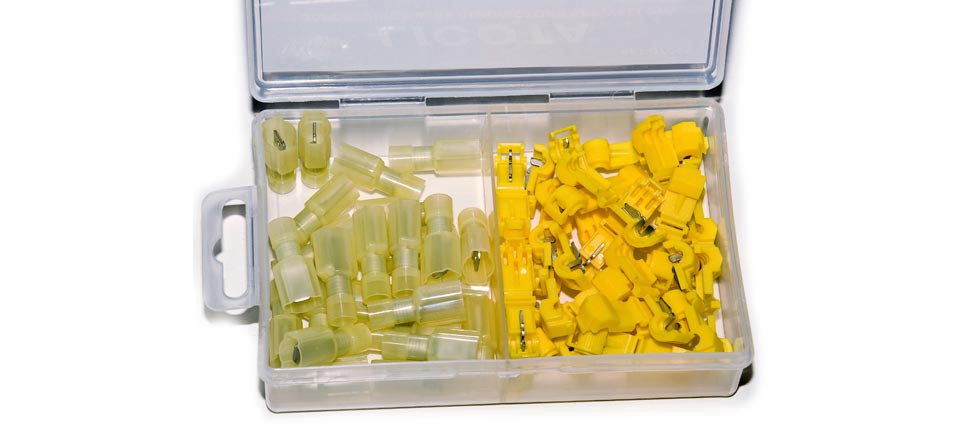 Alkalmas vezetékek toldására, össze/rákapcsolására. Az élénksárga csatlakozó összezáráskor bemetszi a "fővezetéket", majd ennek végére a halványsárga csatlakozóba rögzített másik vezetékkel együtt a sarut rátolva létrejön a két vezeték közti összekapcsolás (elágazás), blankolás nélkül!
