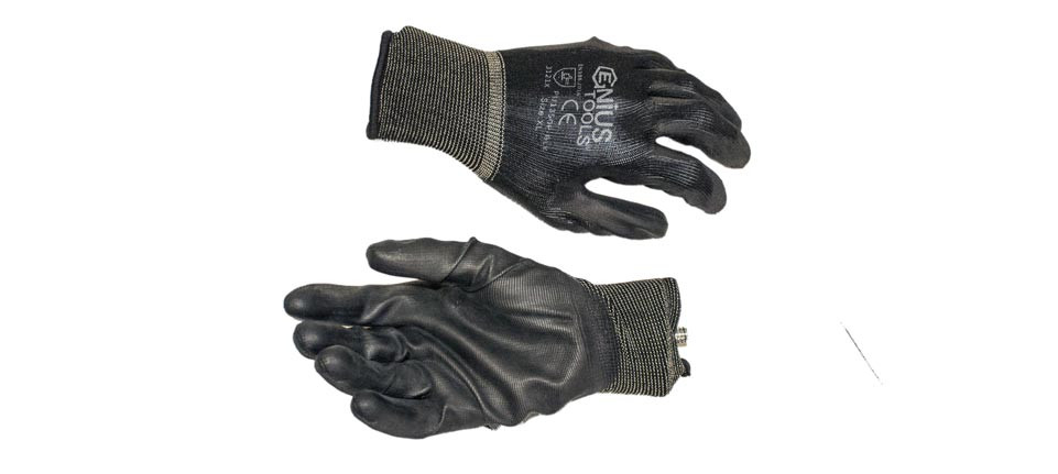 Fekete poliészter szőtt kesztyű fekete tenyérmártott védőbevonattal, mely jó fogást biztosít száraz környezetben.