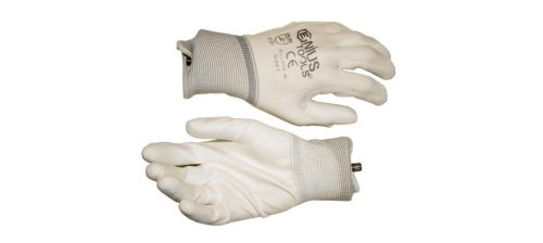Fehér poliészter szőtt kesztyű fehér tenyérmártott védőbevonattal, mely jó fogást biztosít száraz környezetben.